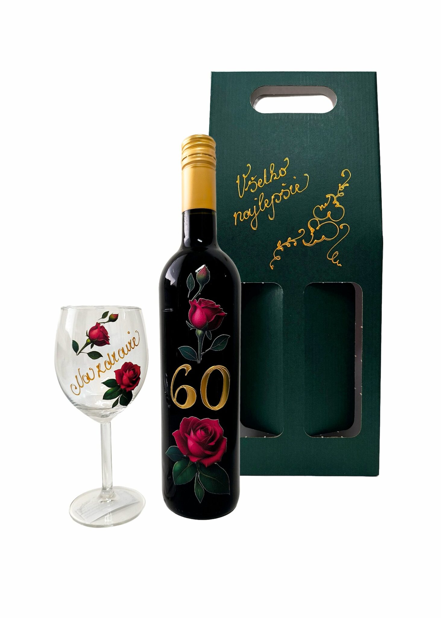 Fľaša Legera 0,75L + pohárik (210ml) s nápisom „Na zdravie“ v zelenom kartóne.