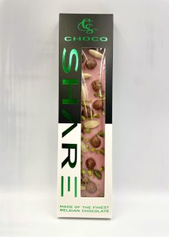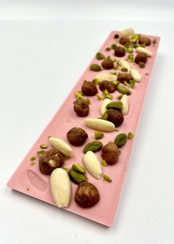 Jahodová čokoláda 30%, 100g – lieskový orech + lúpané mandle + blanšírované pistácie +posyp pistácie