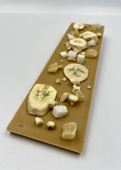 Karamelová čokoláda 30,4%,100g – lyofilizovaný banán + kokosové kocky + ananásové kocky + posyp banán